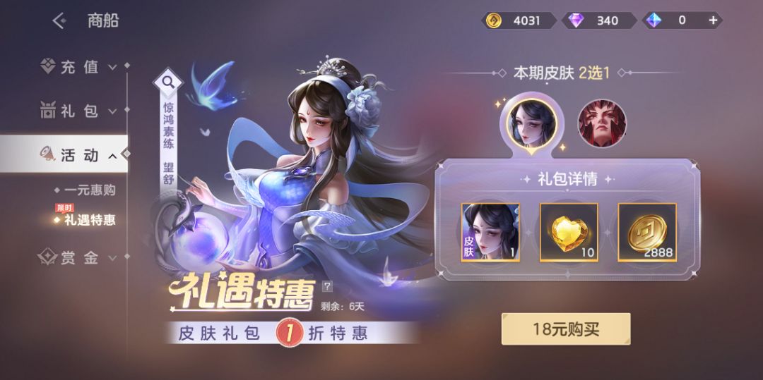 礼遇皮肤礼包限时1折,望舒·惊鸿素练、妇好·灭世之威2选1,还可以额外获得橙心钻*10、金币*2888奖励