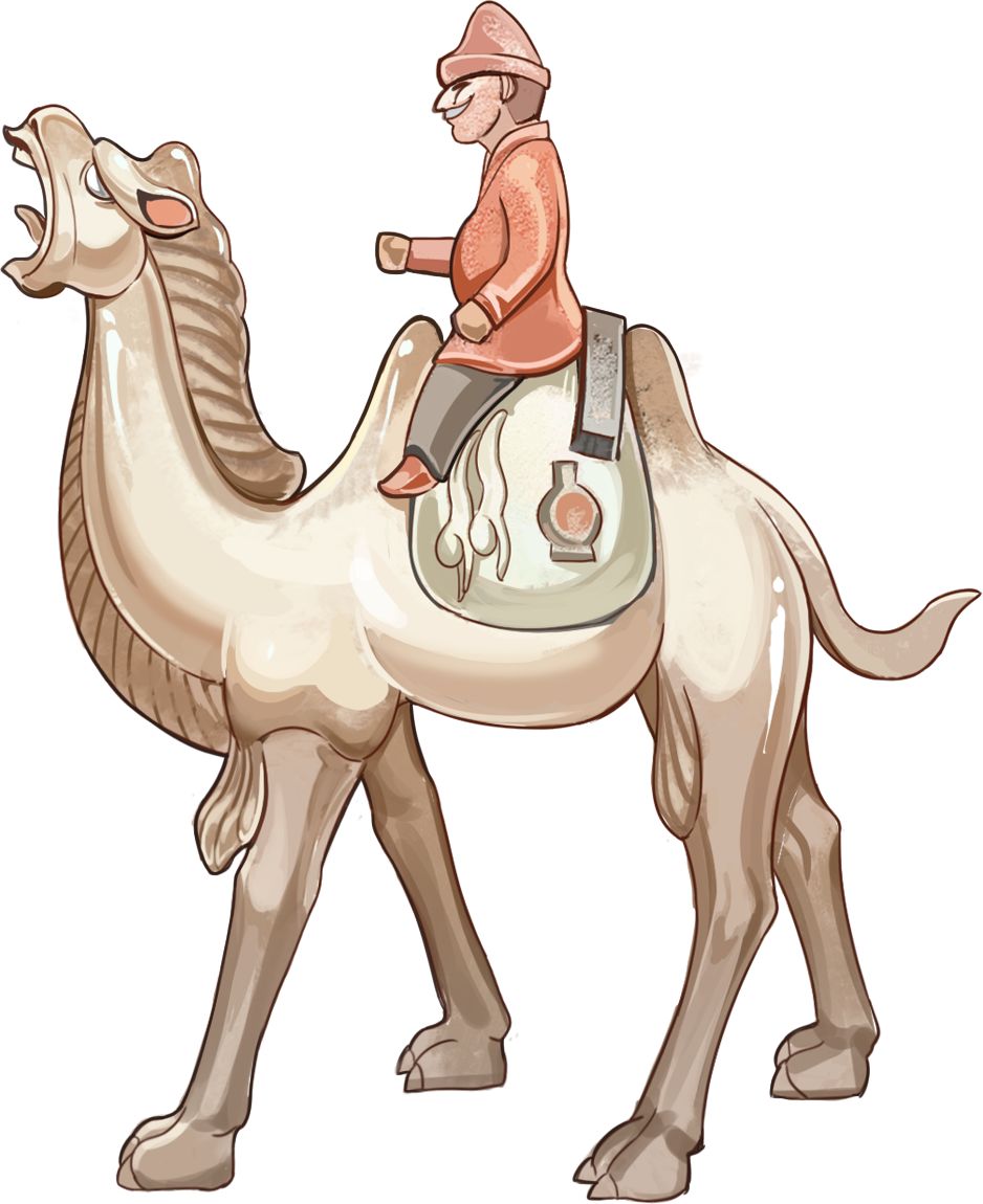 唐三彩中的粟特商人形象,背负波斯琉璃、大食香料,印证《唐六典》中“诸蕃商胡,各以其方物交易”的盛况。骆驼昂首嘶鸣的动态,他阔步为御灵师们带来了奇珍异宝。