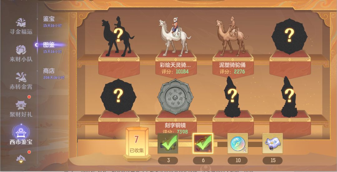 收集解锁图鉴可得进度奖励,解锁至少10件宝物后,将触发剧情<大唐出使>;