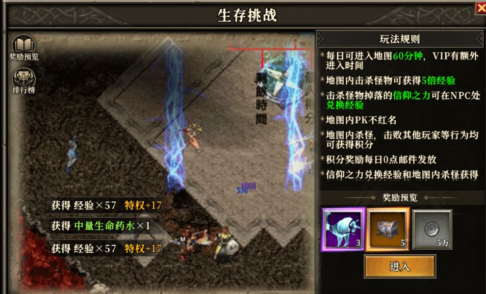 经验地图,每天1个小时时间,VIP8加一个小时时间,地图内击杀怪物可以获得5倍经验,怪物掉落的信仰之力可兑换经验,另外还可能会获得坐骑碎片和洗炼材料,每人必刷!