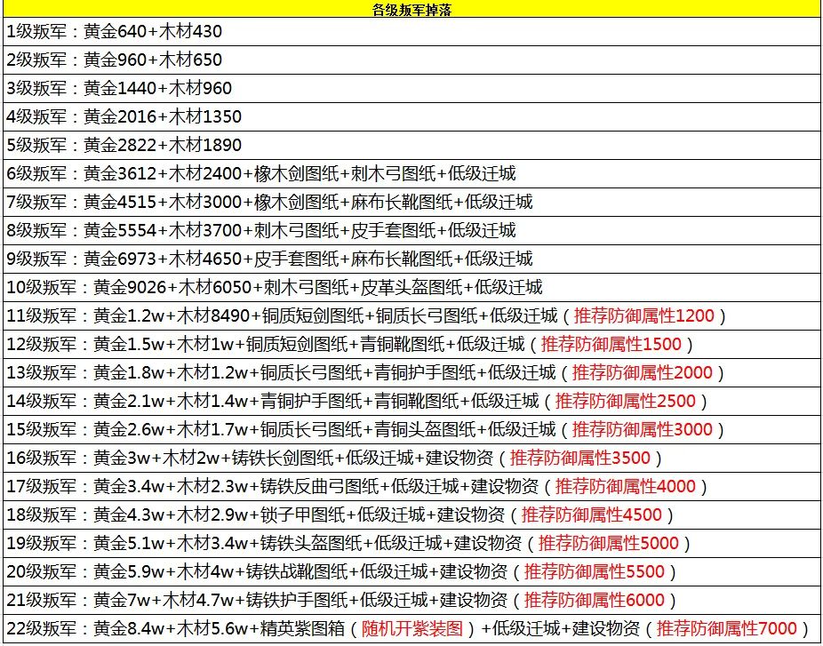 16级叛军:黄金3w+木材2w+铸铁长剑图纸+低级迁城+建设物资(推荐防御属性3500)