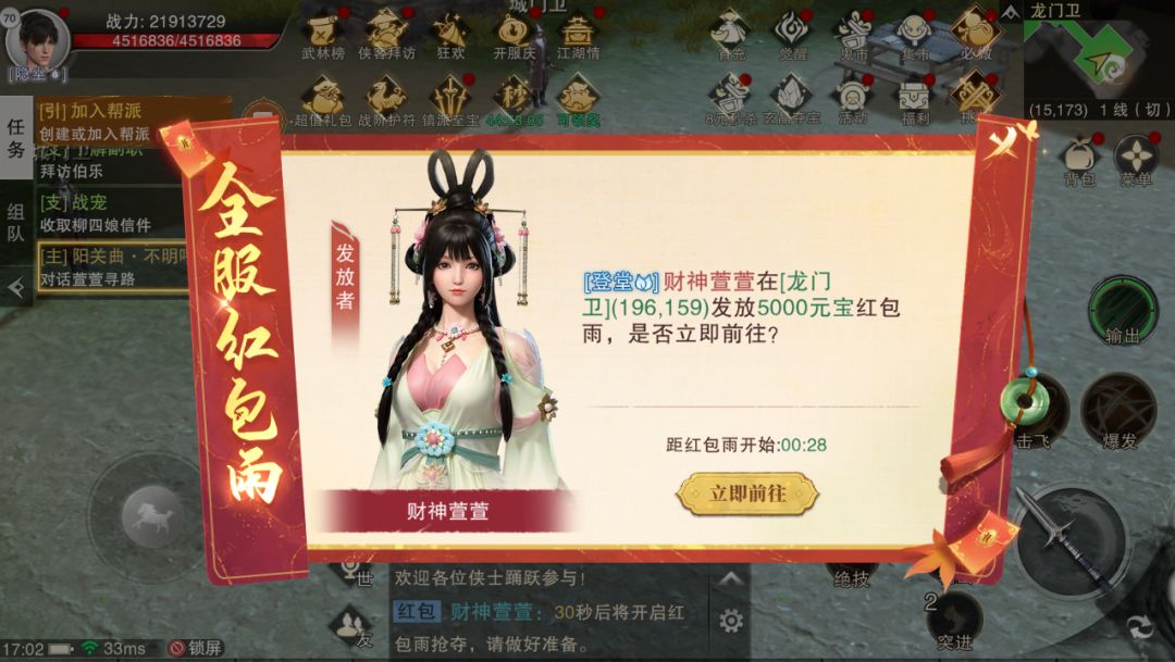开启全服红包雨活动,每日12:15、18:00、21::30,财神萱萱将在龙门卫发放海量红包雨。所有玩家均可前往抢夺,获得元宝、银两等丰厚奖励。活动期间,指定区域内有女子乐团进行表演,为江湖增添一份热闹与喜庆。