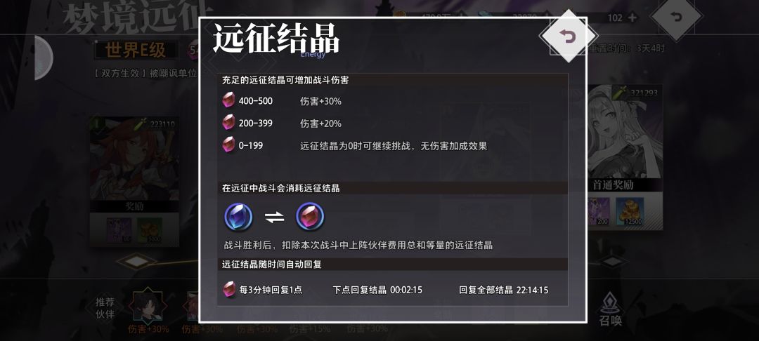 如果开局手牌不好,或者打不过,可以撤退重进,不算挑战失败;被打死了就算挑战失败,只能点击恢复体力才能恢复上一次挑战失败的阵容,梦境远征每周一5点重置,通关到11关的的玩家可以扫荡1-10关,奖励还是非常不错的,玩家可以根据自身情况选择挑战,如果实在打不过了可以等远征结晶恢复满了再挑战,或者是通过退出重开刷初始手牌的方式提高过关率,远征结晶400-500提供30%的伤害,200-399提供20%的伤害,199以下没有任何加成,每次战斗都会消耗上场伙伴的能量相对应的远征结晶数量总和,没能量了等自然恢复即可,每层关卡都有一个对双方生效的buff,玩家可以根据自己的情况选择合理的阵容来通关获得奖励,最后祝大家都能闯关成功,多拿奖励。