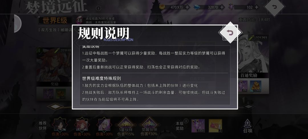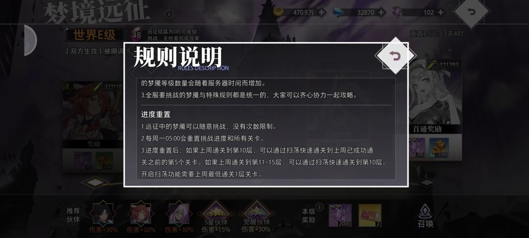 远征在主界面试炼→梦境远征,进入之后会从普通级开始打,每层5个boss,总共15层,击败之后可以获得灵知碎片(前往商城交易所的灵知兑换道具)和召唤之证、精选之证,前十关难度差不多,根据全服玩家综合实力定制的相对应战斗力的boss,11-15关的boss是世界级boss,世界级boss会因为玩家战力的变化而变化,规则也相应有所改变,玩家挑战失败后可以继续战斗,敌方队长的血量会保留上一次战斗失败时的血量,但是玩家在上一轮输掉时带的伙伴将无法再次使用,如果想重置可以点击体力恢复重新挑战,体力恢复每次挑战仅能免费5次。