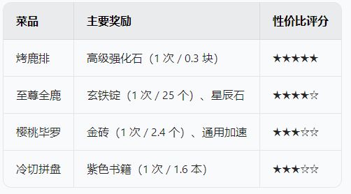 核心目标:通过制作特定菜品(如烤鹿排)捐献获取高级强化石,兼顾其他资源(金砖、玄铁锭等)。