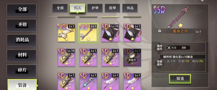 顶级武器: ssr蔷薇之剑(加防御,加格挡率) 下位替代: sr御手杵(行动加防御)