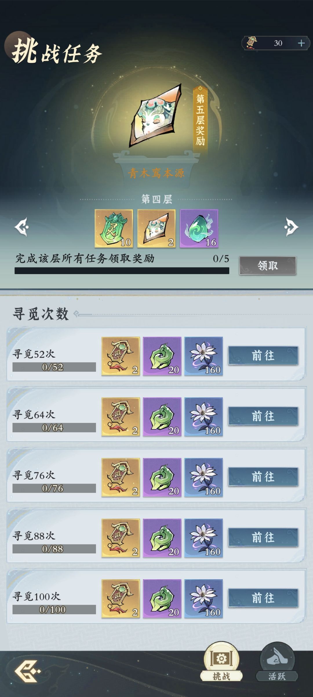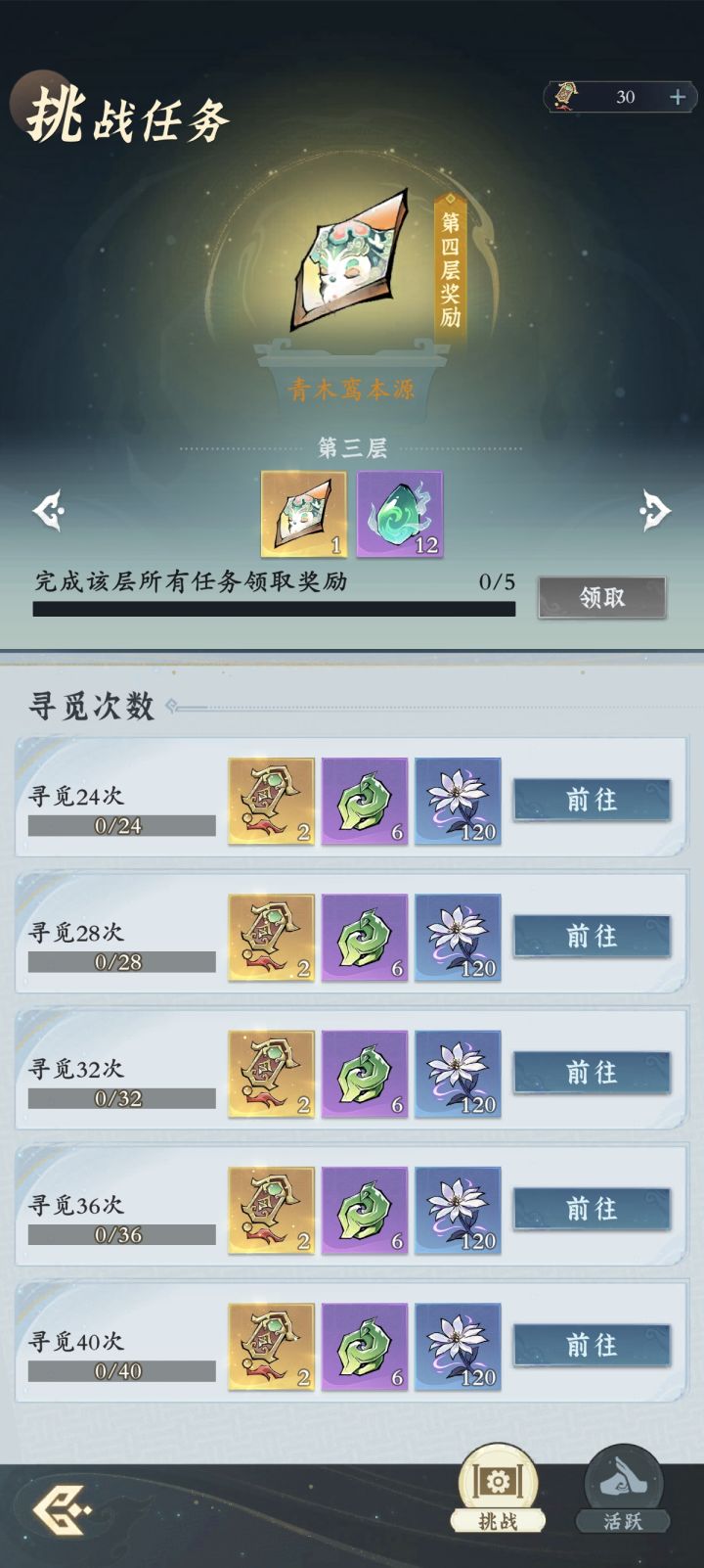 在挑战任务中,从第三层开始,拿满三层奖励一个青木栾本源,四层是两个,五层也是两个。