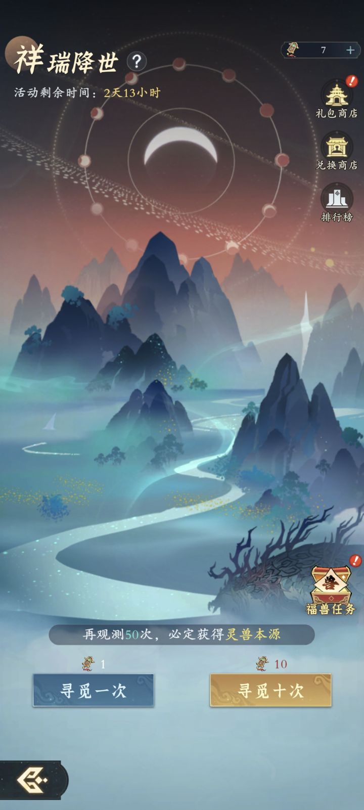 如图所示,祥瑞降世活动,我们主要的目的是拿到青木栾灵兽,解锁青木栾灵兽需要5个青木栾本源。