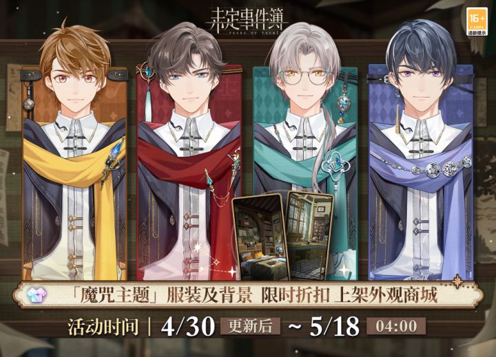 活动期间,「夏彦 · 魔咒」服装、「左然 · 魔咒」服装、「莫弈 · 魔咒」服装、「陆景和 · 魔咒」服装、「奇术卧室」背景及「奇术教室」背景将在「商城-外观商店」页面限时折扣上架,开放购买