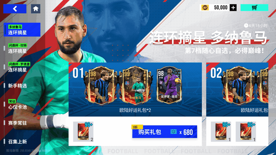 4月25日11时-5月2日11时期间,通过参与活动购买连锁礼包,有机会获取99潜力值西游巅峰门将多纳鲁马、98潜力巅峰中场巴雷拉!