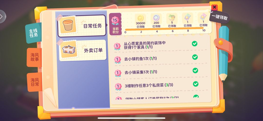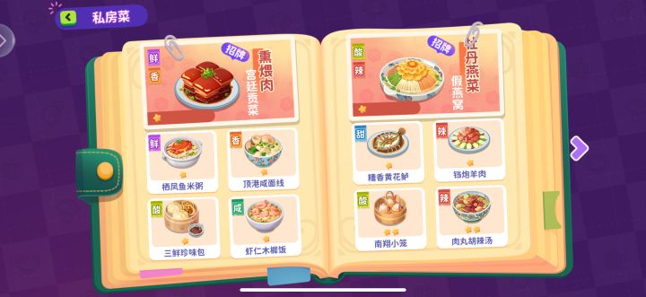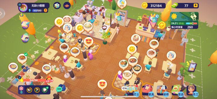 一楼由客人进入餐厅点单就餐获取金币,还伴随有宴会订单以及外卖订单获得额外金币以及建筑材料奖励;三楼由小镇客人以及私房菜组成,按照小镇客人喜爱呈上不同口味的美食从而获得奖励。