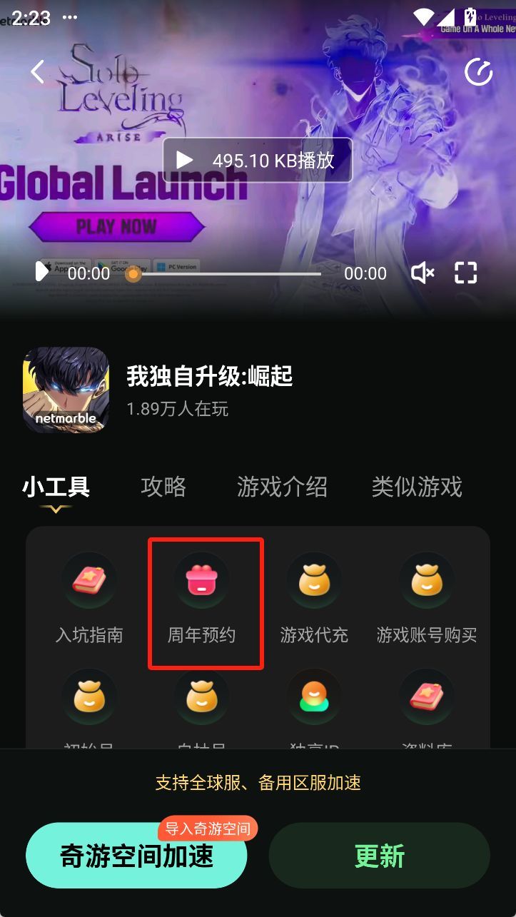 周年预约教程奇游内搜索【我独自升级】进去游戏主页-找到【周年预约】