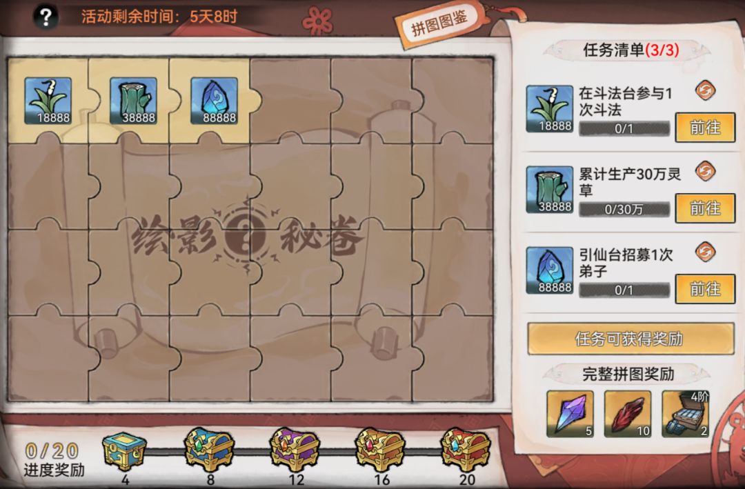 活动期间,祖师可接取拼图任务,完成后可获得奖励。