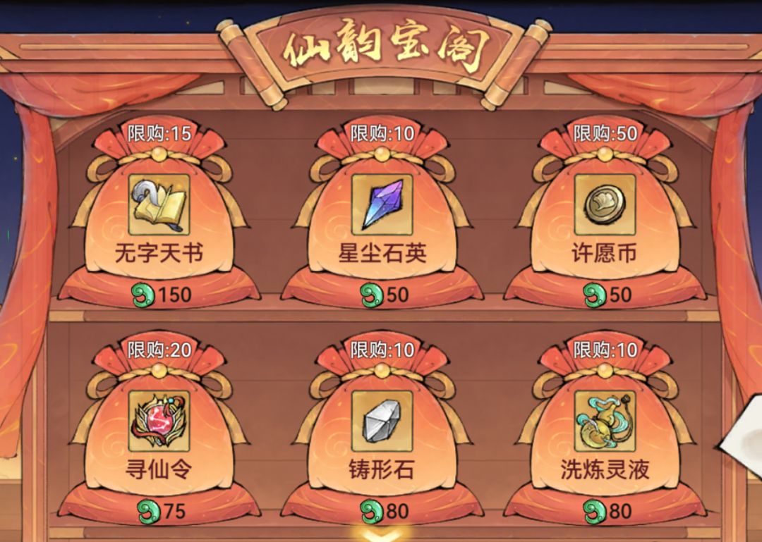 祖师可消耗灵玉限量购买星尘石英、无字天书等奇珍物品。