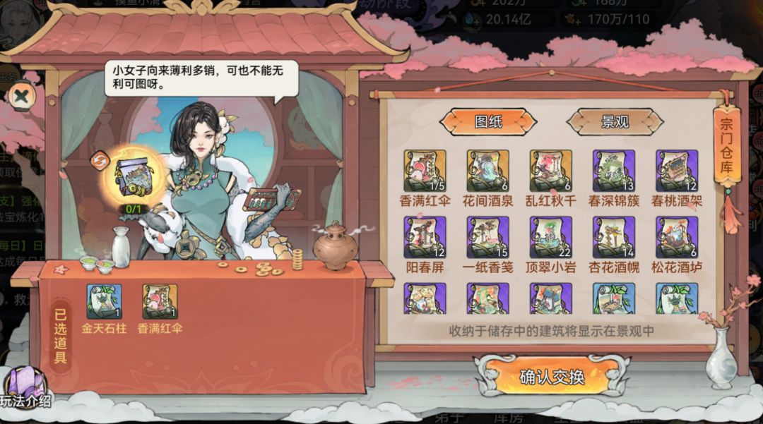 祖师可用闲置的图纸或者建筑与仙商交换稀有建筑图纸或加速符、天命敕符等道具。