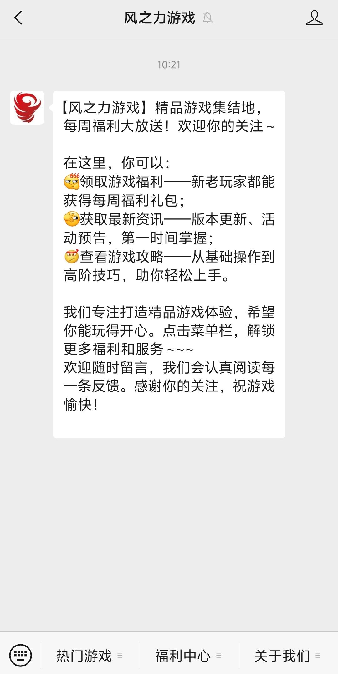 欢迎关注官方服务号:风之力游戏(关注有礼)