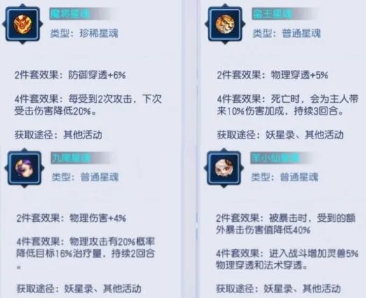 星魂属性优先选物攻、力量、速度、敏捷,其次为气血和体质。星魂套装可在以下四个星魂中自由组合:魔将、蛮王、九尾、羊小仙。推荐组合如下: