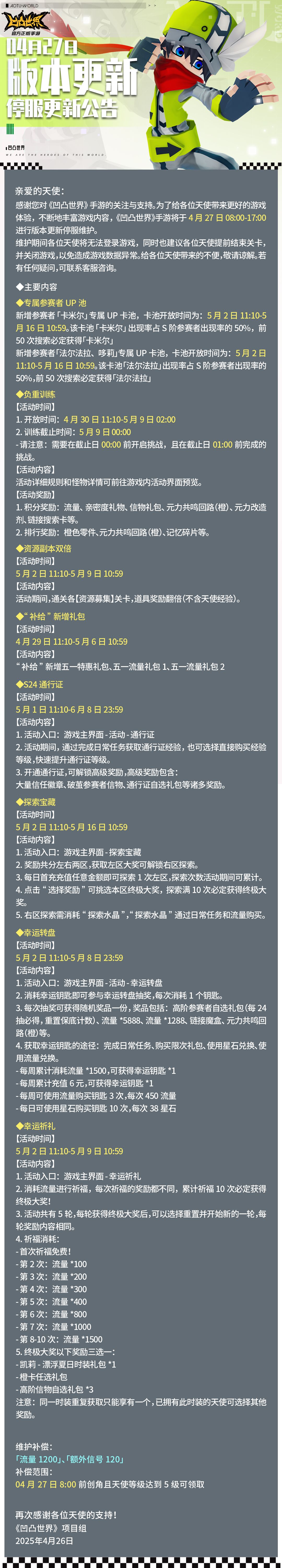 《凹凸世界》手游将于4月27日08:00-17:00进行停服维护。