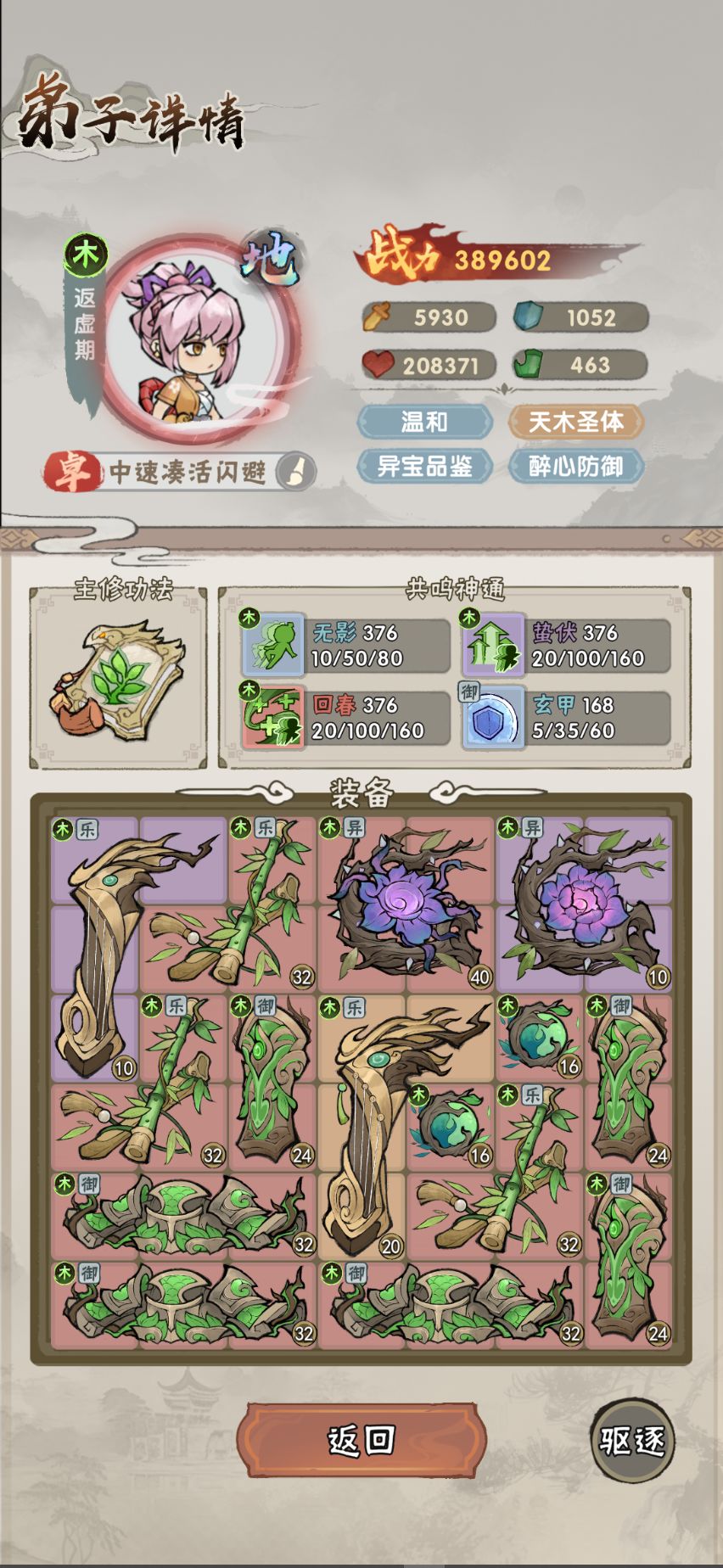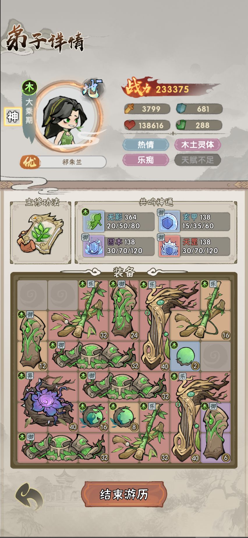 点评:木系为数不多的输出手段,但由于缺乏闪避,在应对土系时也表现一般。可以当个娱乐玩法使用,在特定情况下可能有效(如某些毒有利的boss战)