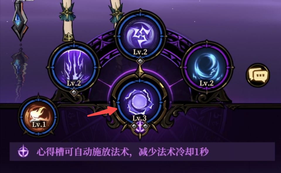 心得槽法术建议装配冷却时间短的技能,因为放在该位置的技能会减少1秒冷却时间,选择本身冷却时间短的技能,这样心得槽的技能释放约等于无缝衔接。