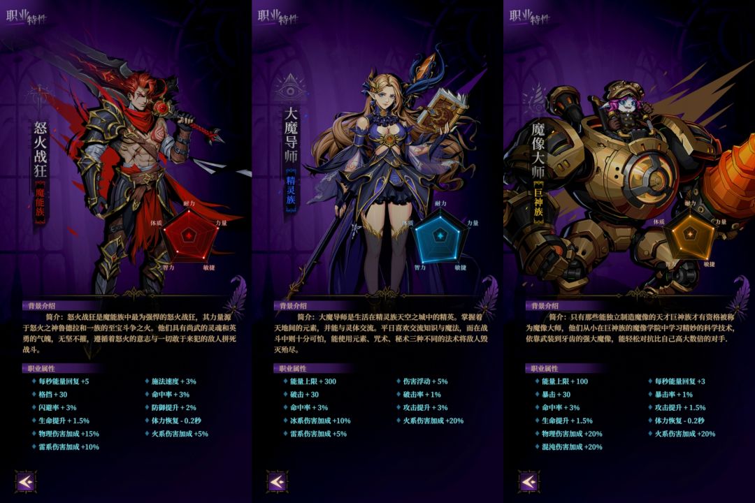 自由选择职业,目前游戏内有三个职业,分别是:大魔导师(法师)、怒火战狂(战士)、魔像大师。