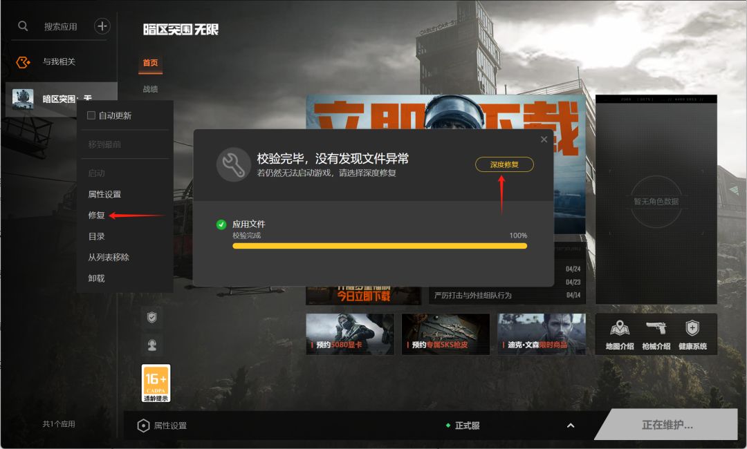 A:如果您在安装完成后遇到“游戏依赖库安装失败”的提示,需要您点击“重试安装依赖库”,并在安装成功后重启电脑。在重启电脑后,请在侧边栏选择《暗区突围:无限》后点击右键,点击修复-深度修复,便能成功安装。