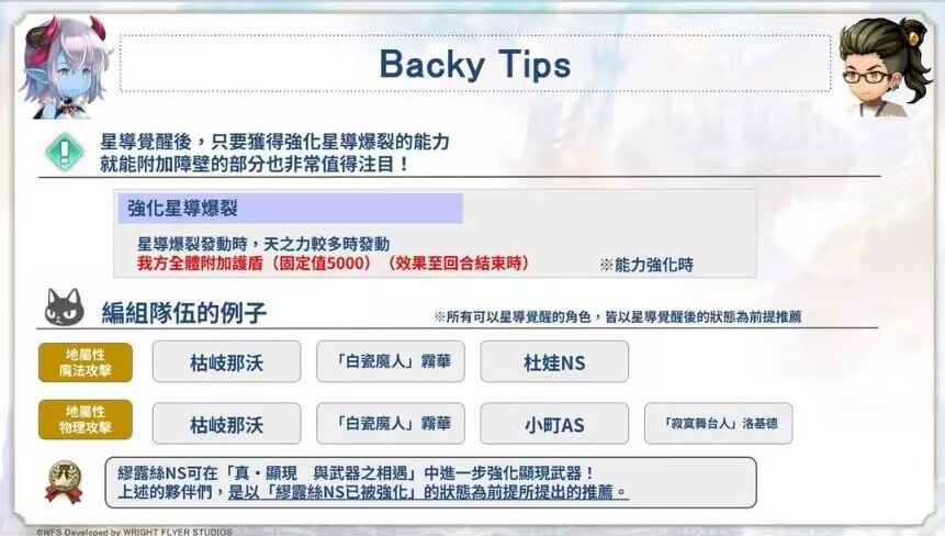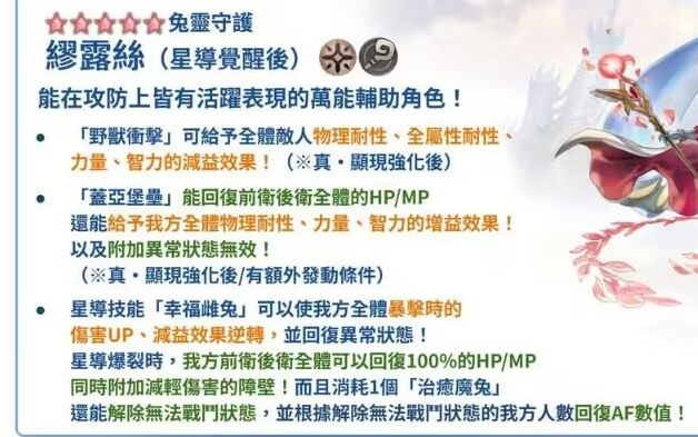 【星导觉醒】:①开局自身攒3珠+附加坚持;②物魔爆伤30%UP+减益逆转+回复异常,(星爆时)全体回满HP&MP+附加100%减伤盾1次,(耗珠追加)复活队友+根据复活队友数回复AF(最大5人/75%)。