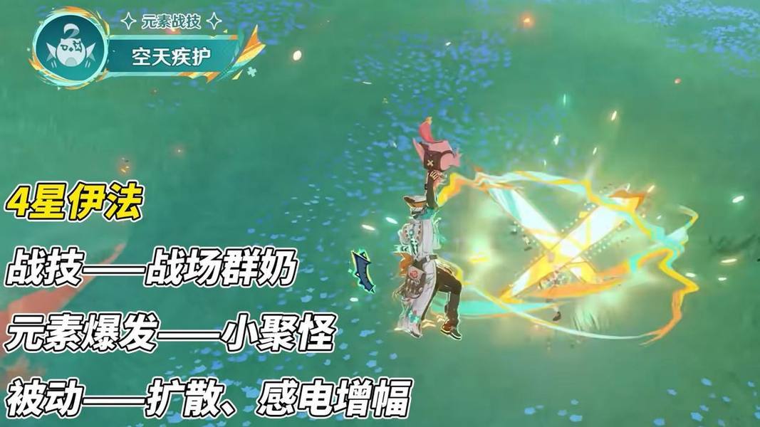 伊法(4星、风元素、法器角色):被动提升全队造成的扩散与感电伤害,施放战技将借助咔库库悬浮移动,在此期间攻击可治疗全队角色,元素爆发则是造成伤害并小聚怪一次。