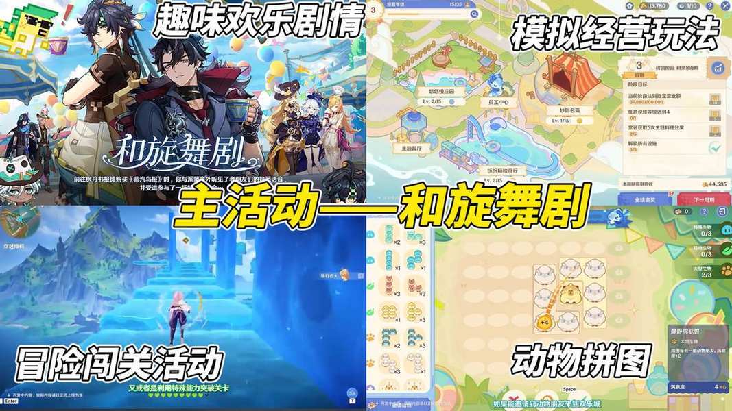 和旋舞剧(模拟经营),枫丹经营活动。细分为三种玩法:各种角色将会一起协助你经营这座欢乐城,升级设备、扩建场地、招募员工;活动期间也有一些趣味场地,需要旅行者第一个前往测试;悠悠慢庄园的小动物,也等待着大家协助分配居住环境~