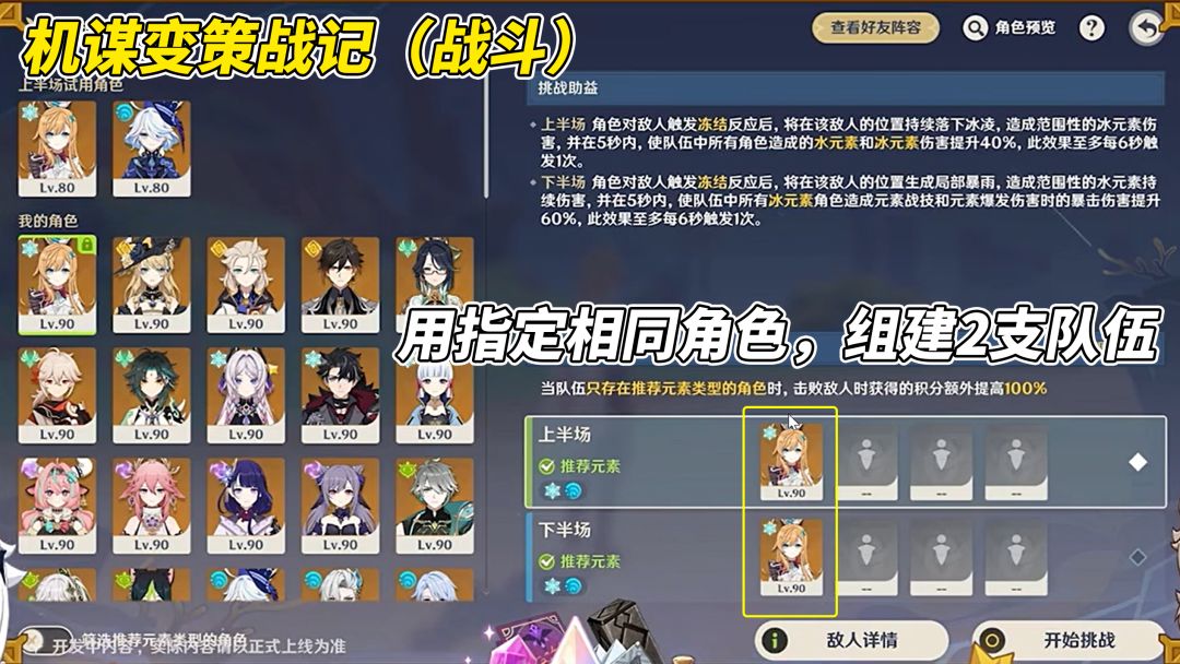 机谋变策战记(战斗),分多个挑战关卡,随时间解锁。玩家需要依照关卡指定角色,配备上下半两支队伍赢得战斗获取积分。