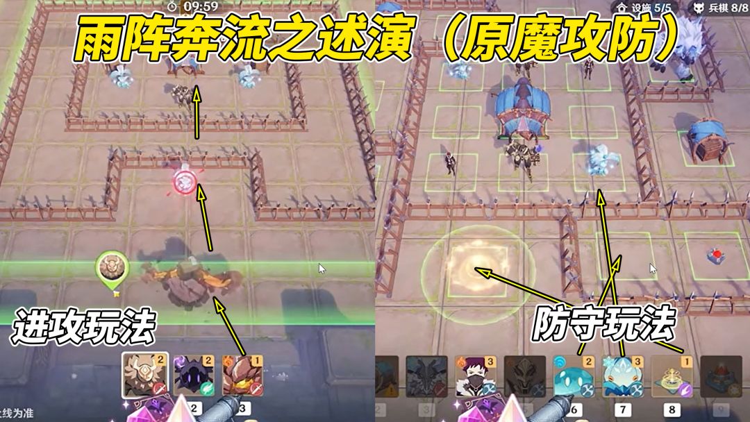 雨阵奔流之述演(原魔攻防),全新的攻防模式,需要布置防御地图,或进攻阵容,阻挡或消灭敌人,赢得胜利。兵种皆为原魔,可围绕场地布置一些障碍物,用于干扰对方行进。感觉不够过瘾的玩家还可进入1V1玩家匹配,互相攻防,比拼速度~