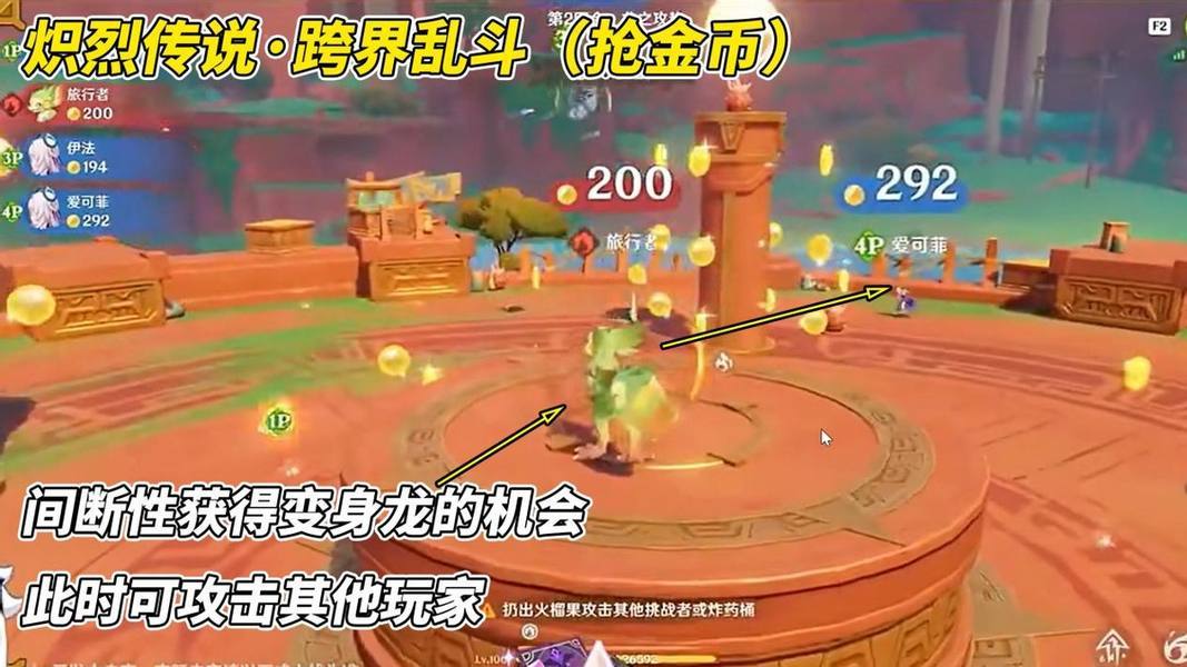 炽烈传说·跨界乱斗(抢金币),有点儿类似当前5.5版本「奇逸角技隆隆擂台」,也是多位旅行者匹配抢金币,区别在于此次无道具,改为玩家间断性化身为龙,可攻击其他玩家。