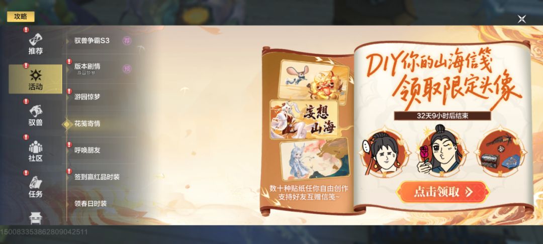 在妄想山海×《牡丹亭》联动之际,为了让大家感受古人手作信笺时的体验,山海管理司准备了本次的【花笺寄情】活动,你可以手工DIY属于自己的信笺——完成任务获取贴纸,制作属于你的独家信笺,向好友或山海NPC们送出祝福,来获得限定头像等丰富奖励吧!