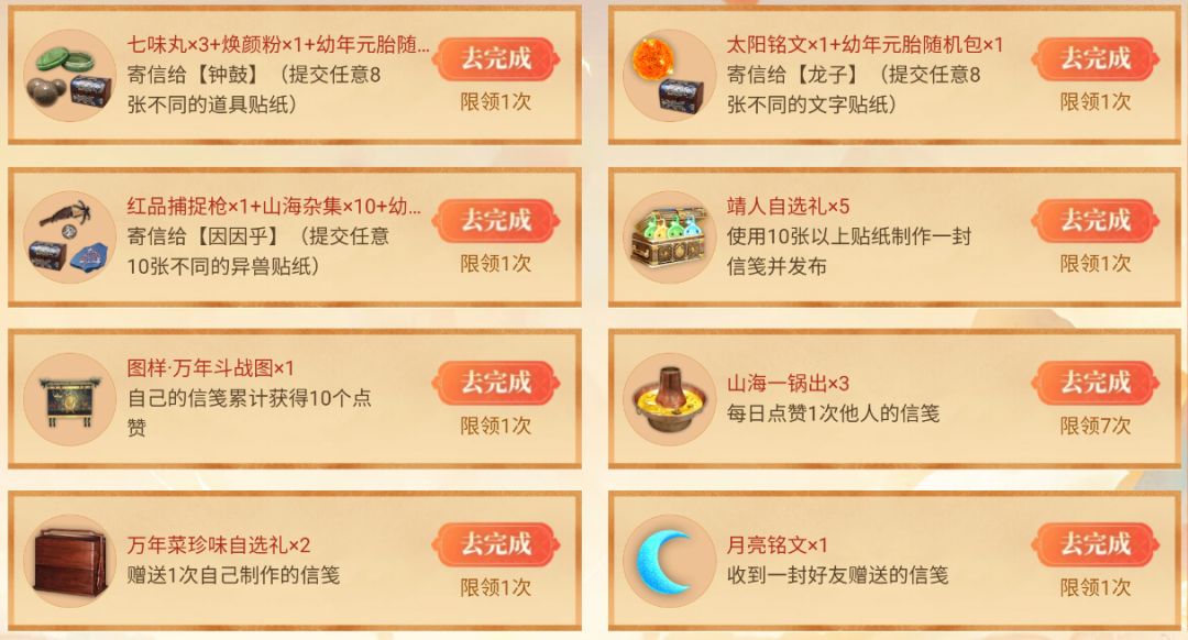 小贴士:旅者们点击页面上不同NPC下方的【寄信】,可以进入DIY页面,大家需要根据页面说明中提示的贴纸数量与类型,去选择下方的贴纸,并将贴纸按照自己喜欢的方式摆在信笺中,点击【上传】就可以将你满意的信笺寄出啦~
