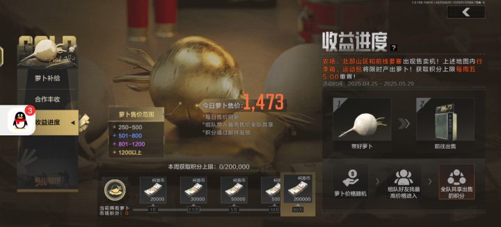 自助的活这次的活动要做四个星期,平均每个星期30万knb也没有必要专门去做这个活动,大前线要塞或者农场时候,摸旅行箱运动包,顺便检点萝卜,看看旁边有没有售卖机,顺便卖了就行,要注意的是,普通地图基本上全是一两个萝卜,没必要打普通图,最好是打封锁跟强化封锁里面,基本上全是十个到30个左右,运气好的话,一把就可以把这个星期的目标做完,相当于半个大金了,而且萝卜的价格是按照全队里面价格最高的那个人,多匹配几把队友,总会有那么几个价格高的,总体来说,这个活动还是挺好的,不用主动去做,打游戏时候顺便做做就行