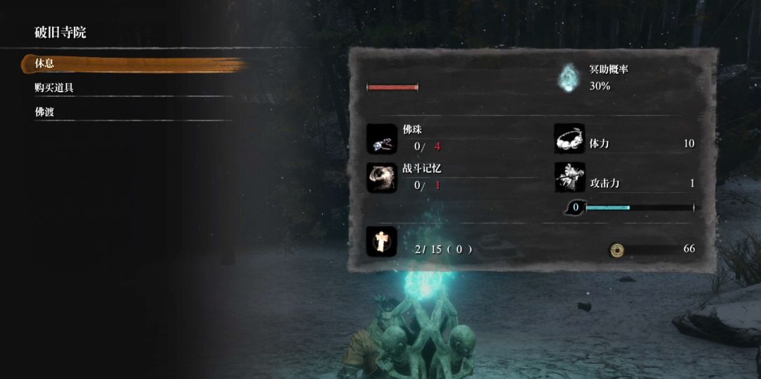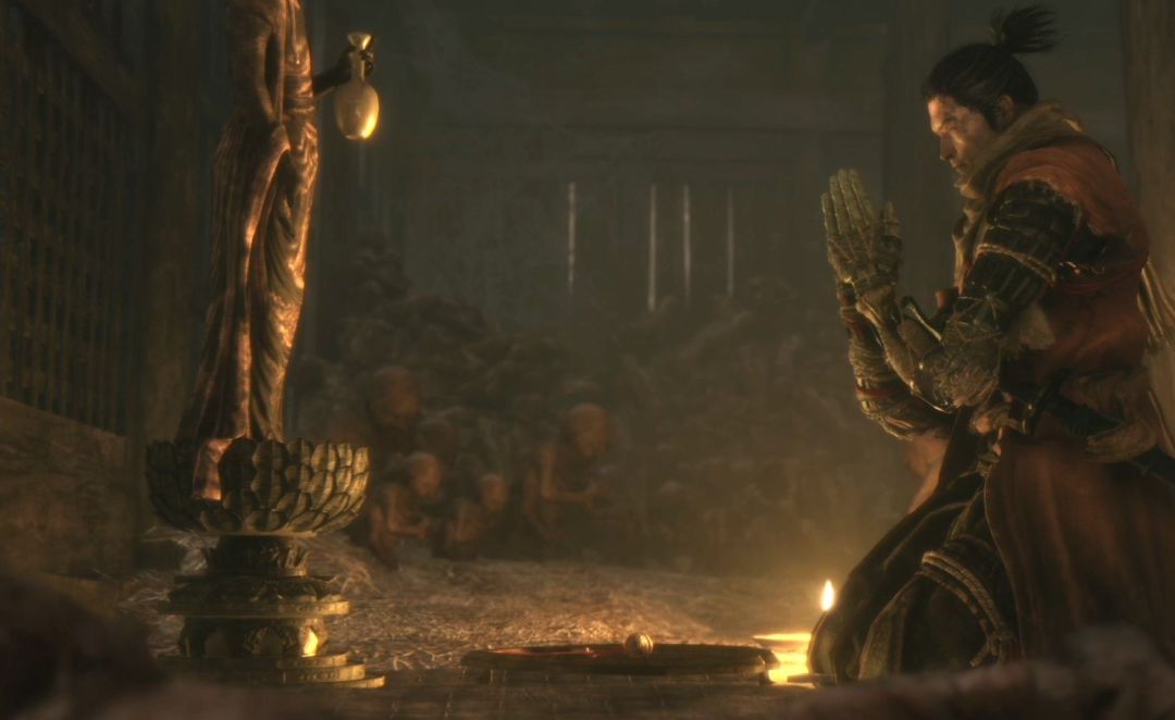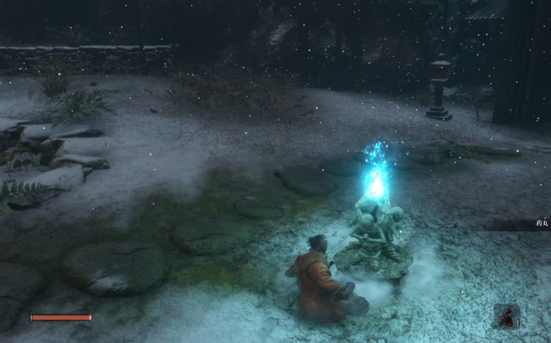 在院子中央鬼佛面前与鬼佛对坐,这里的鬼佛就是魂系列的“篝火”,相信魂系列老玩家非常熟悉。具体作用:可以在鬼佛处休息恢复血量,补充伤药葫芦的次数以及超过所持上限而被传送至鬼佛的道具;但除了精英怪和BOSS之外的所有敌人也会复活。