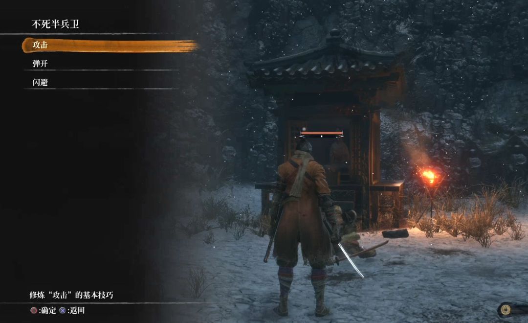 这之后,不要离开寺院,而是向右走,会遇到不死半兵卫,与其对话直接开战,击杀他还是比较简单的,他会教我们基础的战斗技巧,以及战斗机制,也可以与他进行联系,总之在能够熟练掌握他教的所有技巧之后再上路才不会太受苦。