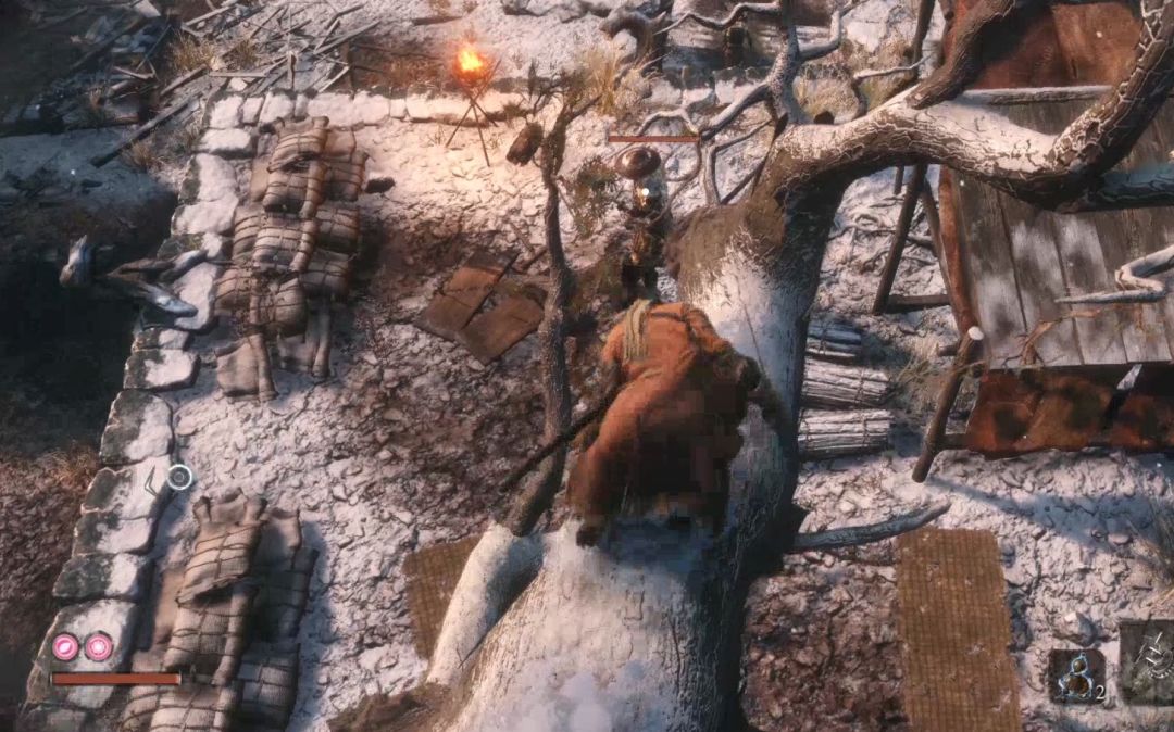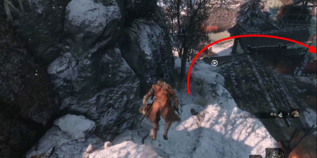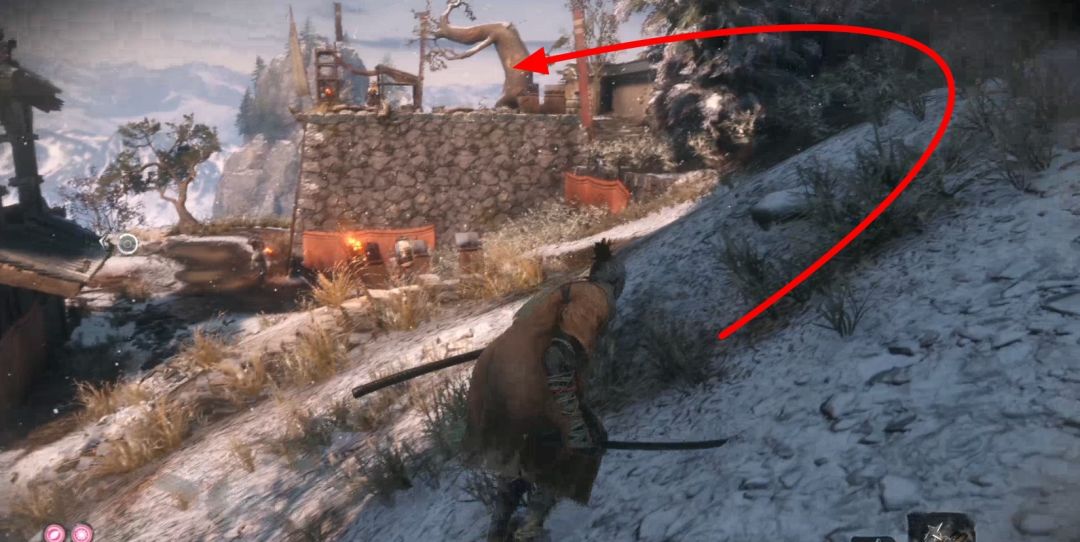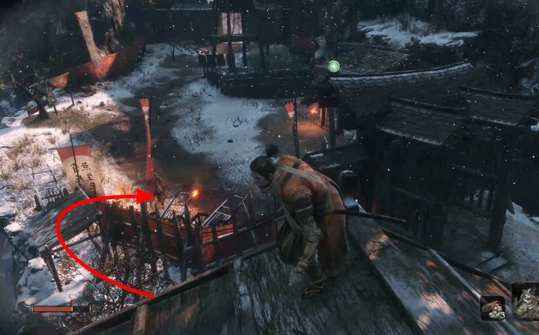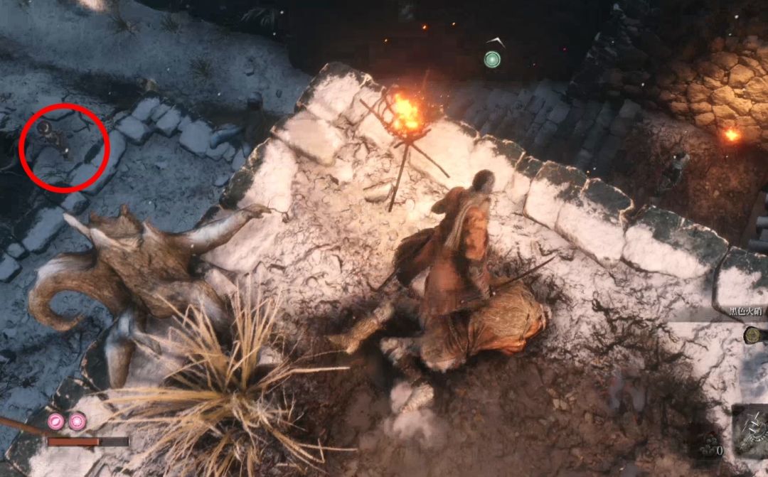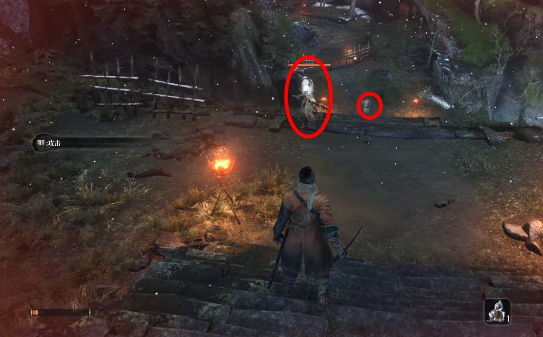 背刺拿火炮的敌人,不然以后对付会很难。下图右上角的山上有祭祀帮商人,可以购买罗伯特的爆竹,是一个义手忍具,可以买了回寺庙安装在忍义手上,商人处卖的钱袋可以购买死后钱袋不会掉落,所以可以当银行存钱,有钱了买钱袋总没错。