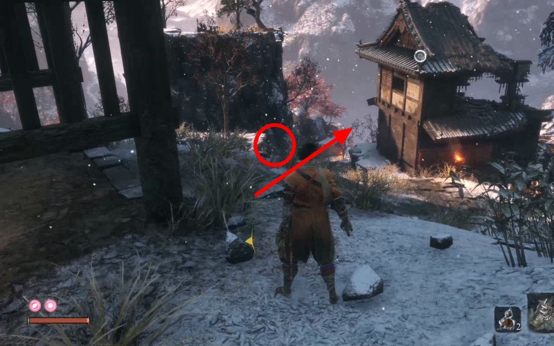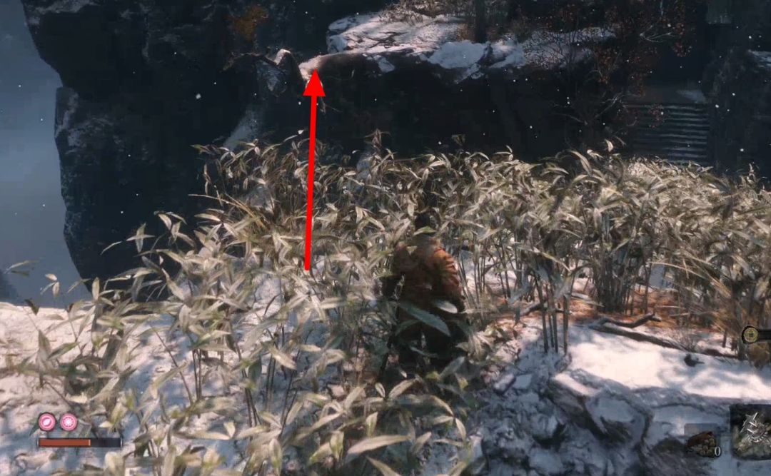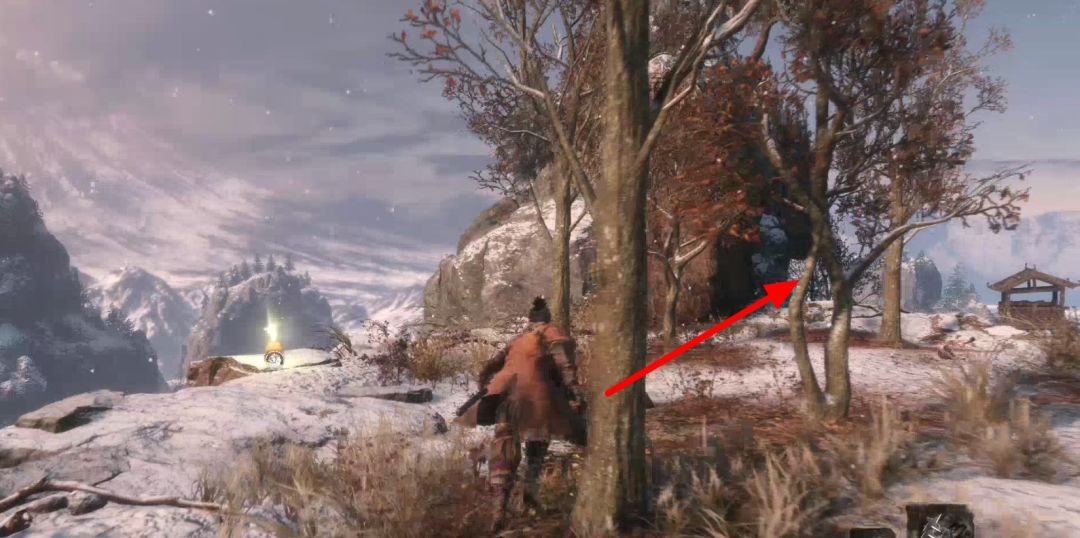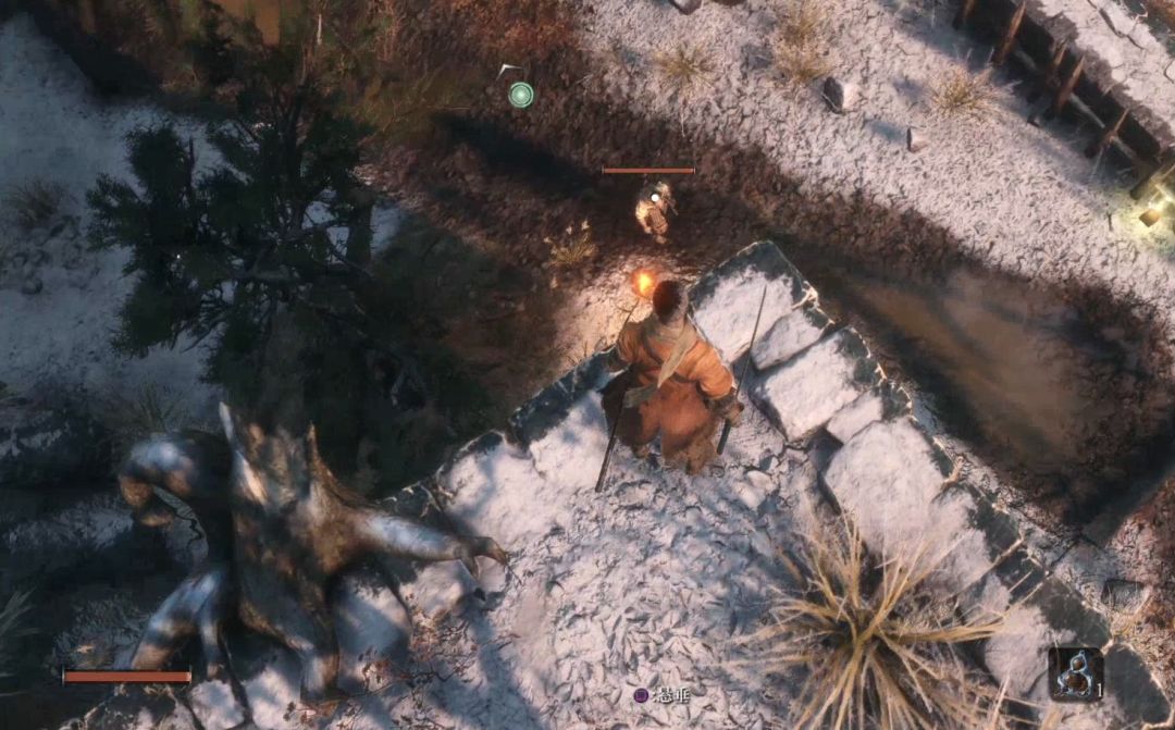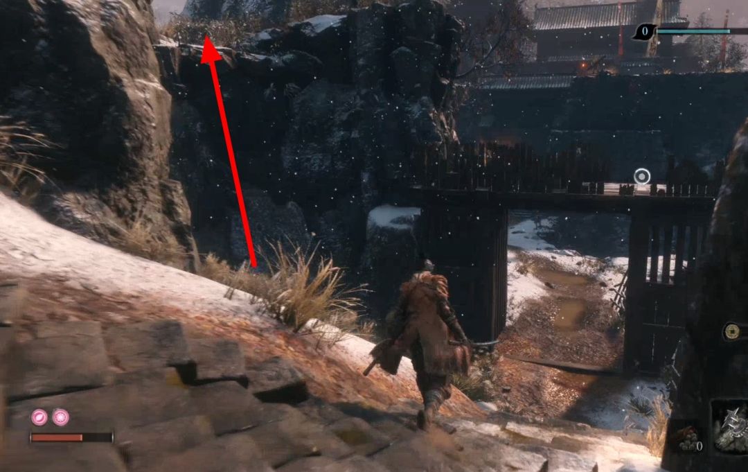 背刺拿火炮的敌人,不然以后对付会很难。下图右上角的山上有祭祀帮商人,可以购买罗伯特的爆竹,是一个义手忍具,可以买了回寺庙安装在忍义手上,商人处卖的钱袋可以购买死后钱袋不会掉落,所以可以当银行存钱,有钱了买钱袋总没错。