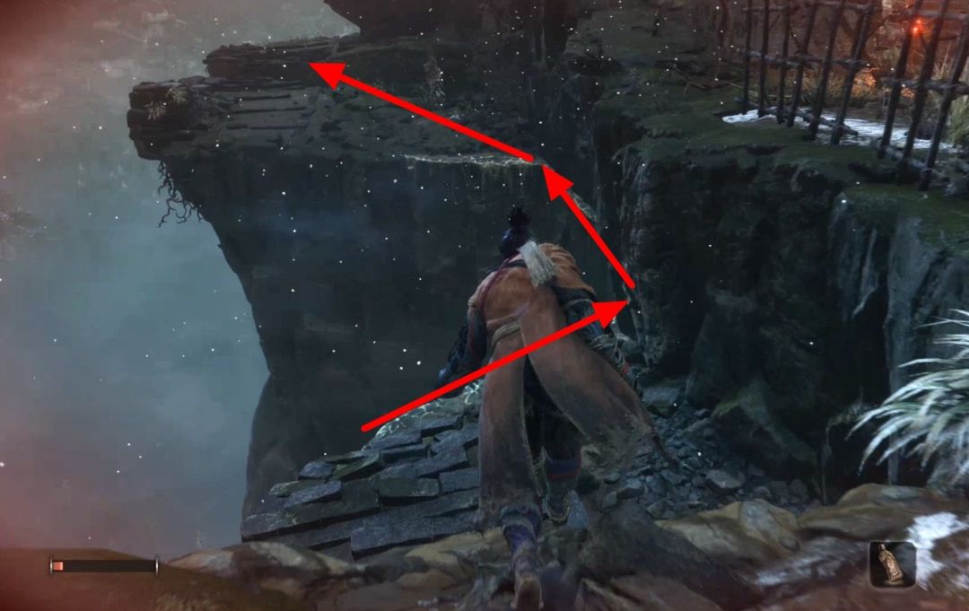 此时我们跟着提示,按照下面三张图的红色箭头路线走。白色的边缘是可以用手抓着悬垂的,日后用处很多