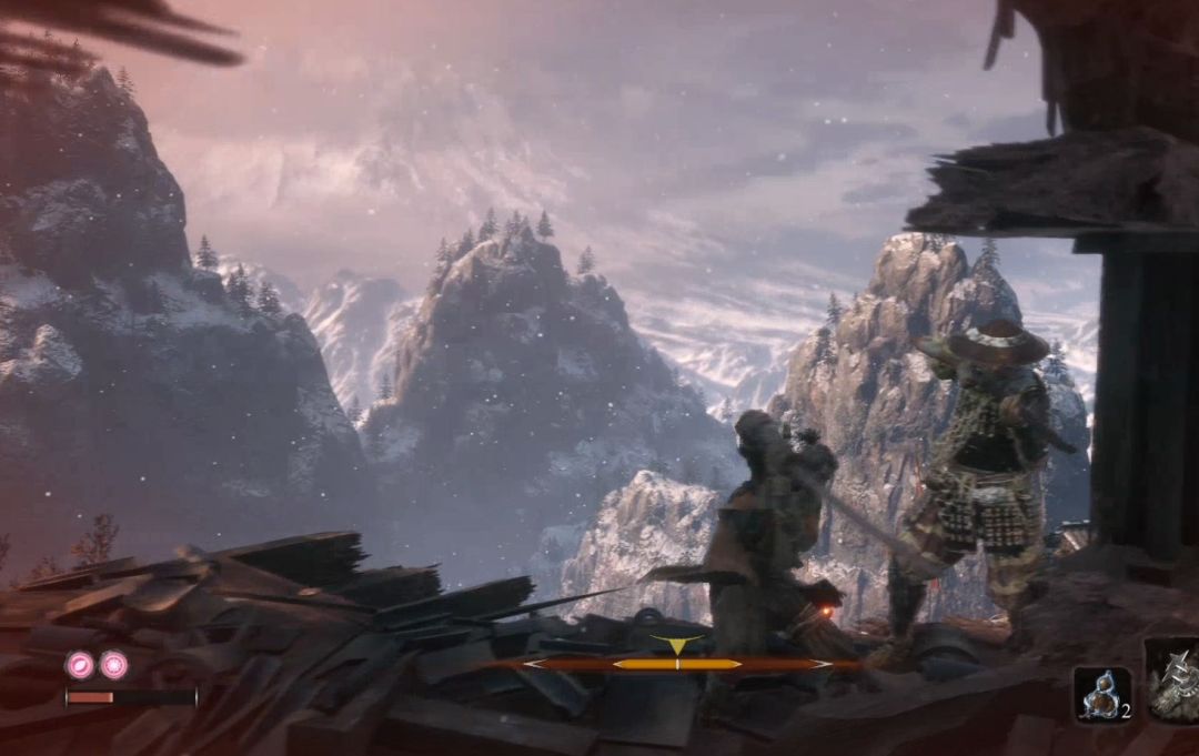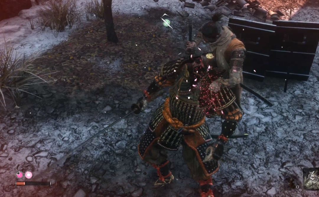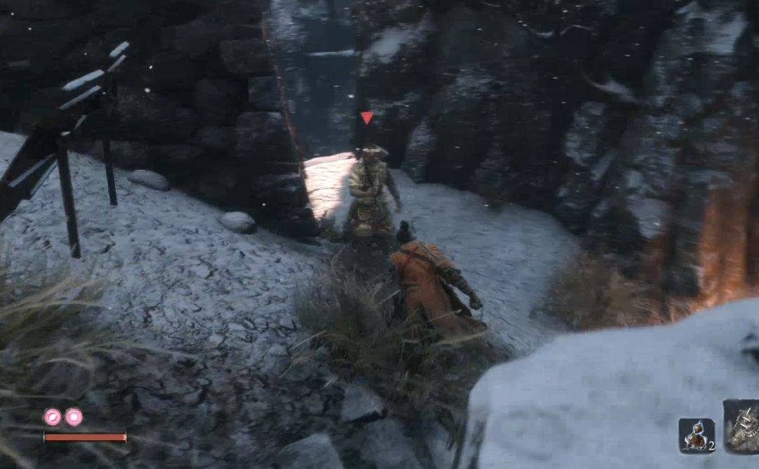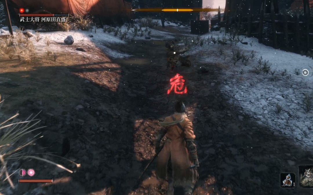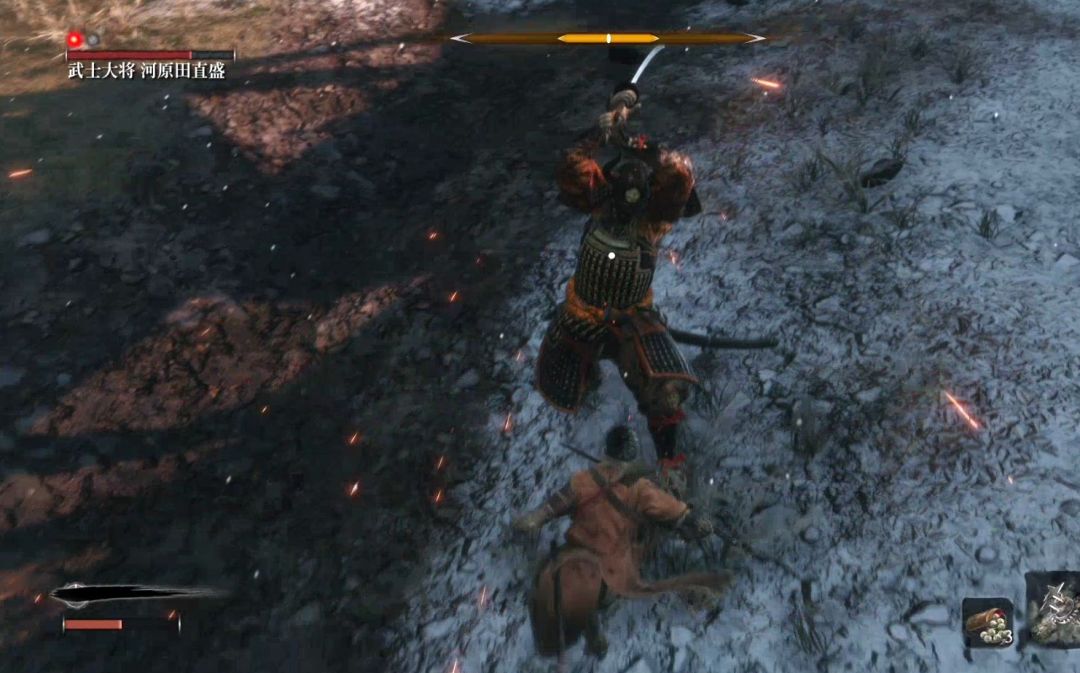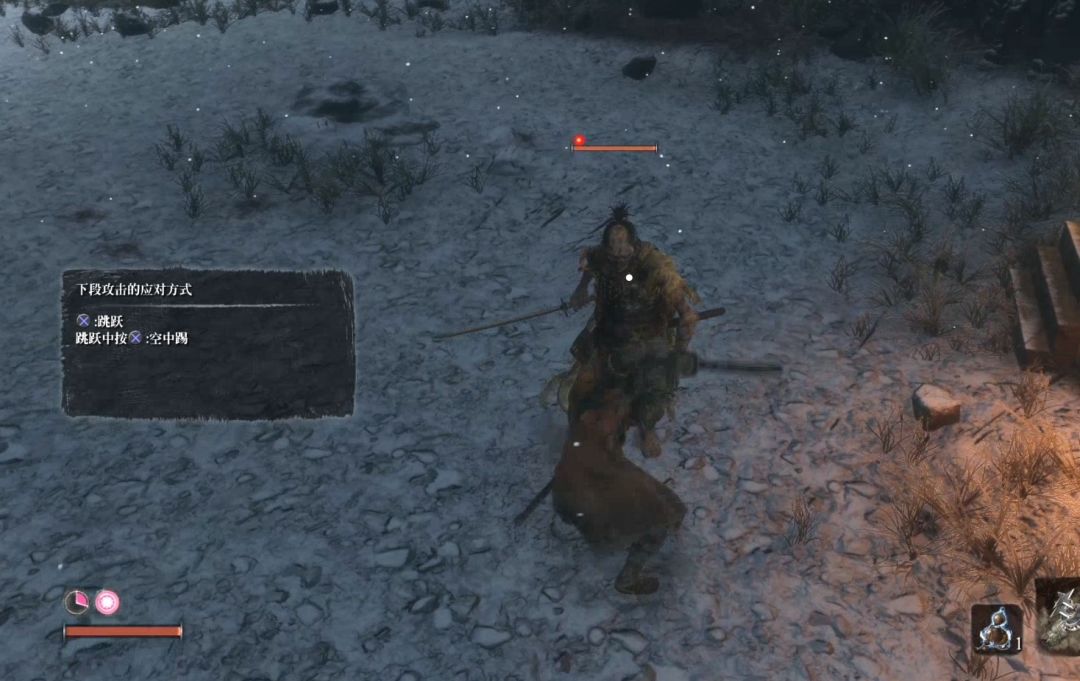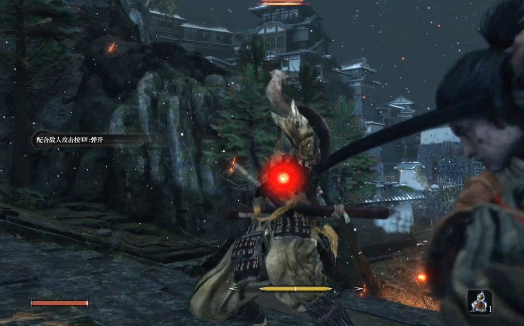 背刺他一次之后进入战斗。此战会引入新的战斗机制“危险攻击”危险攻击无法防御、可以弹反(但是对于普通玩家来说难度很高),建议还是见招拆招,面对突刺攻击和擒拿攻击直接垫步或者跳跃闪开,面对下段攻击直接跳跃踩他。如果对出招时机把握不好一定不要执着于用弹开弹反突刺攻击。