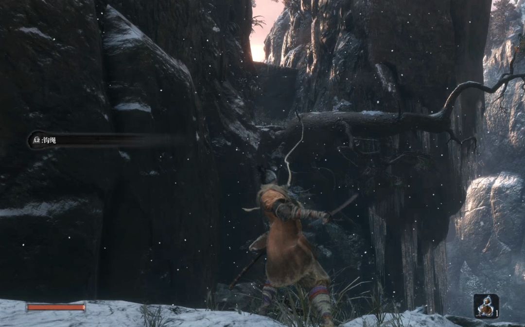离开破旧寺院,悬崖边,看到绿色的圆圈,可以使用忍义手的钩绳过去。以后遇到这种标记,是绿色可以直接使用,灰色需要再靠近一点才能使用,绿色有一个红杠则需要调整位置使用。