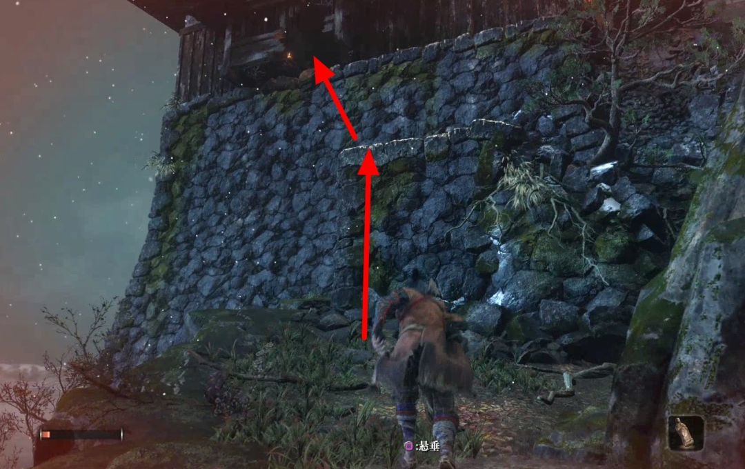 过来之后一直向前走,到下图位置,使用钩绳到苇名城·城邑鬼佛处,并点燃鬼佛。