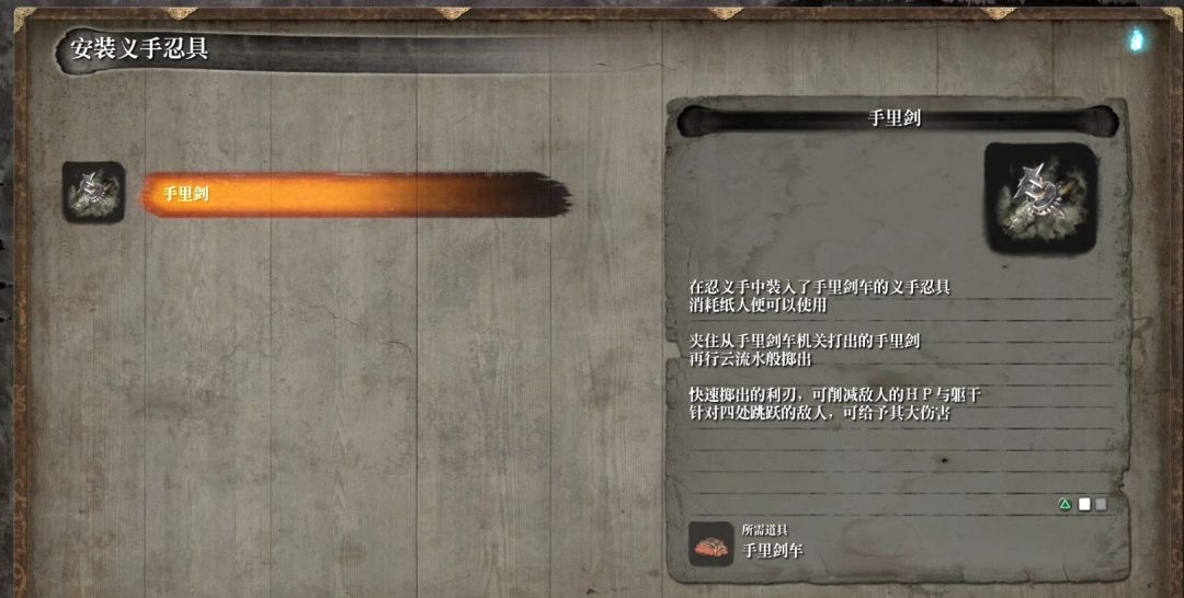 点燃篝火之后,来到前面房子二楼的豁口内,拾取手里剑车,可以让我们的忍义手释放手里剑,在日后对付没有防具的敌人十分有用。