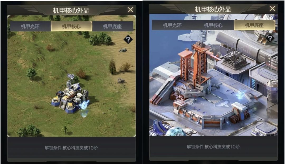 科技突破到10阶后可解锁相应的机甲核心外显,包括机甲光环,机甲核心与机甲底座: