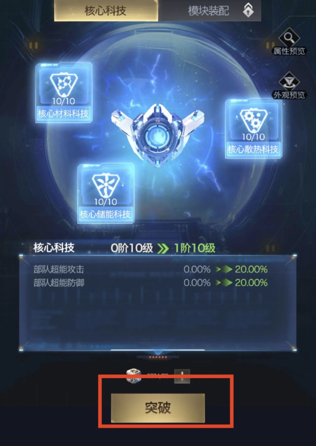 绍核心科技分为核心材料科技、核心散热科技、核心储能科技,每种核心科技可以单独升级,升级后会提升部队属性。