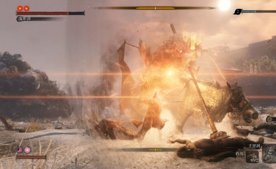 本攻略提供两种打法,第一种,永远保持下图的距离,他冲过来就按住防御键,继续拉开距离,他头上什么时候有绿色箭头,就用钩绳过去输出3刀,时间较久,安全系数高。本战关键道具:爆竹,用爆竹可以让鬼形部的马硬直,借此可以输出4-5刀。所以想简单击杀鬼形部,就用爆竹吧。
