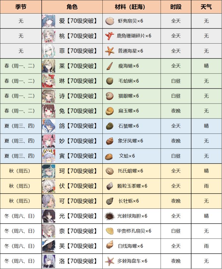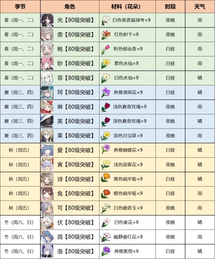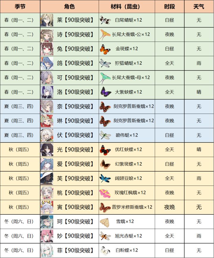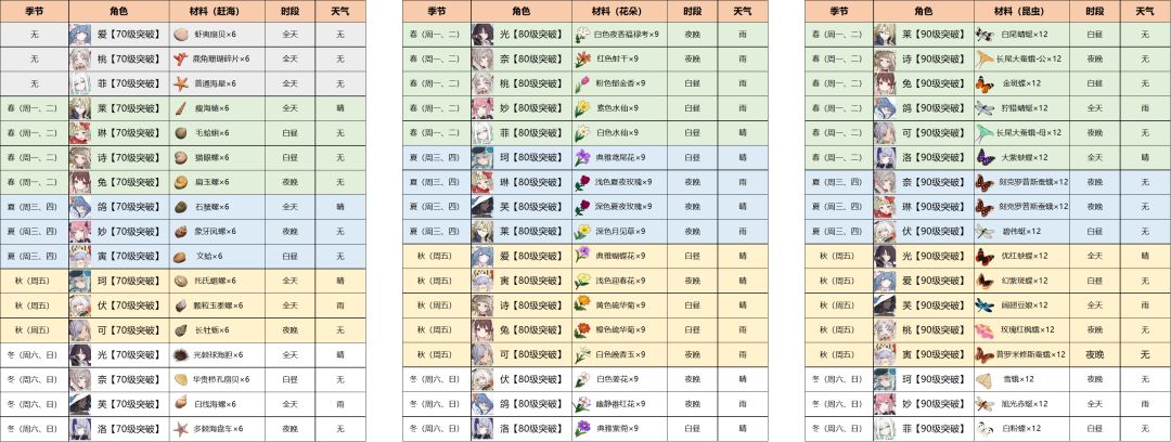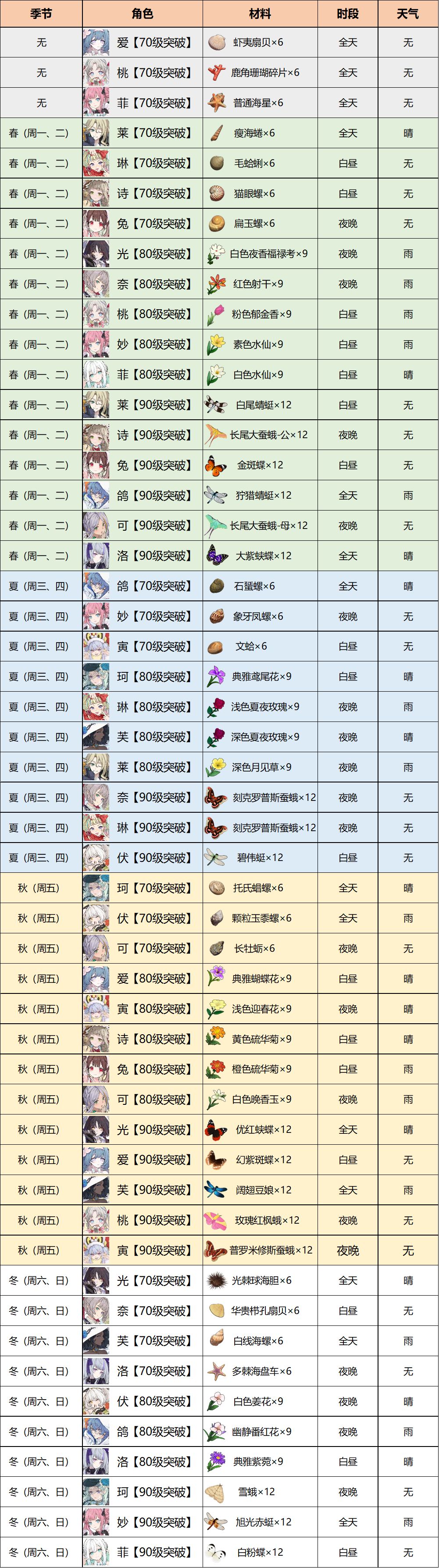 20、40、60级的突破材料是料理、手工、纺织哦,不属于采集材料,不在列举图表中哦 )