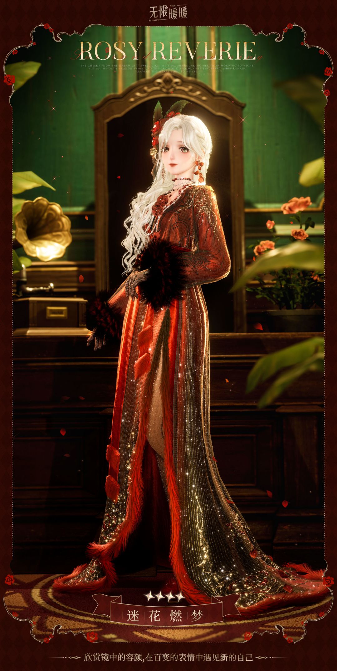 「迷花燃梦」进化后为套装「迷花燃梦·涟漪」。套装焕新完成后可获得「迷花燃梦·苔痕」。