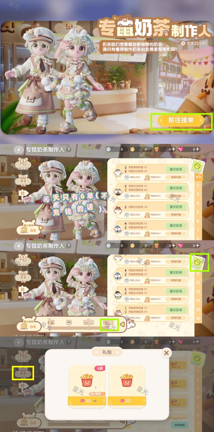 在做限定食谱时先进活动页面看看今日外卖单所需要食物,优先做每日食物!!!每日6单(不氪金),如果想要最后一套衣服奖励(需要氪金)每日6单(16天)共有96点,还需要34点(优先购买每日5折3份薯条*3)如果食物不够提交任务,可以点击呼叫外援(一个订单需要10颗月光水晶)但还是尽量用食物去提交!如图2